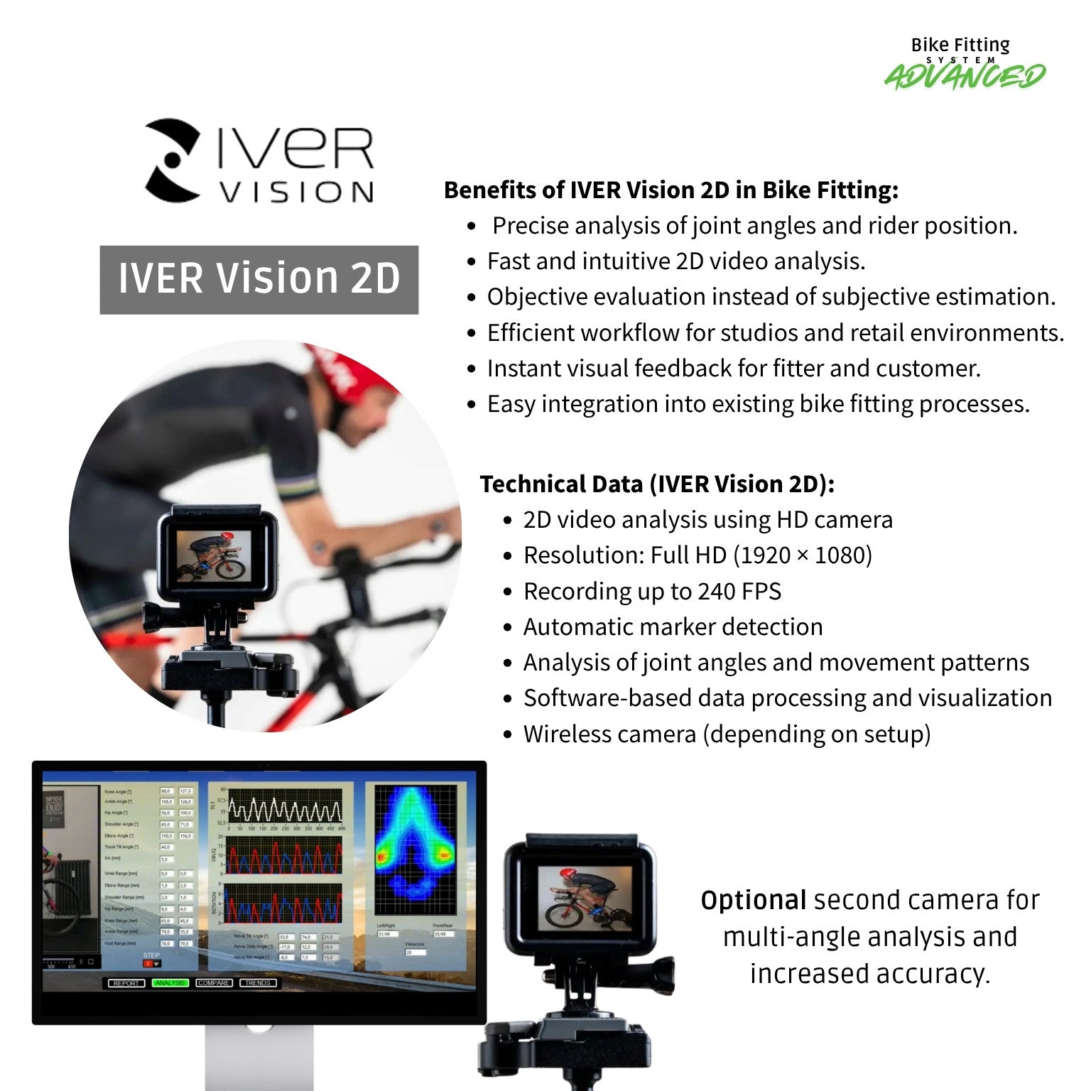 IVER BIKEFIT 2D + SmartCover The Advanced Bike Fitting System combines precise saddle pressure measurement with 2D motion analysis for well-founded and objective bike fitting decisions. By combining pressure mapping and video analysis, you get a complete picture of pressure distribution and body position – the ideal solution for professional bike fitters and discerning specialist retailers. The Advanced Bike Fitting System combines two central technologies of modern bike fitting: Dynamic saddle pressure measurement with the Velometrik - SmartCover 2D motion analysis with IVER Bikefit 2D The result is a precise and objective analysis of seating position, pressure distribution, and movement sequences – in an efficient and practical workflow. The IVER Vision 2D software analyzes rider movement using HD cameras and automatic marker recognition. Joint angles, knee movements, and position are calculated and visualized with high accuracy. At the same time, the SmartCover provides high-resolution data on pressure distribution in the saddle, including information on pressure peaks, asymmetries, and pelvic movement. Choose the right options for your system here and take your bike fitting to the next level. Request an individual offer More information on the SmartCover BT